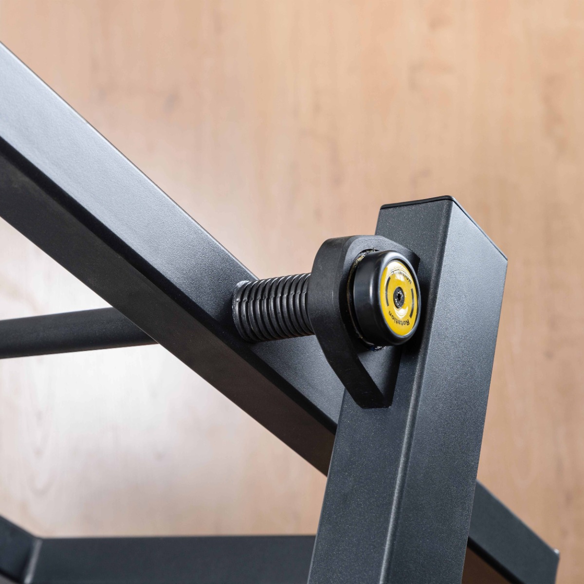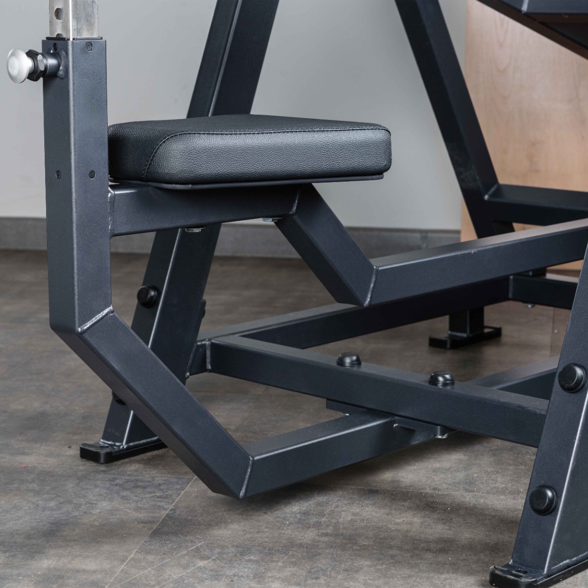 Опорные элементы оснащены прямоугольными резиновыми подпятниками с отверстиями для фиксации к полу. Такая конструкция гарантирует устойчивость тренажёра, равномерное распределение нагрузки и защиту напольного покрытия от повреждений.