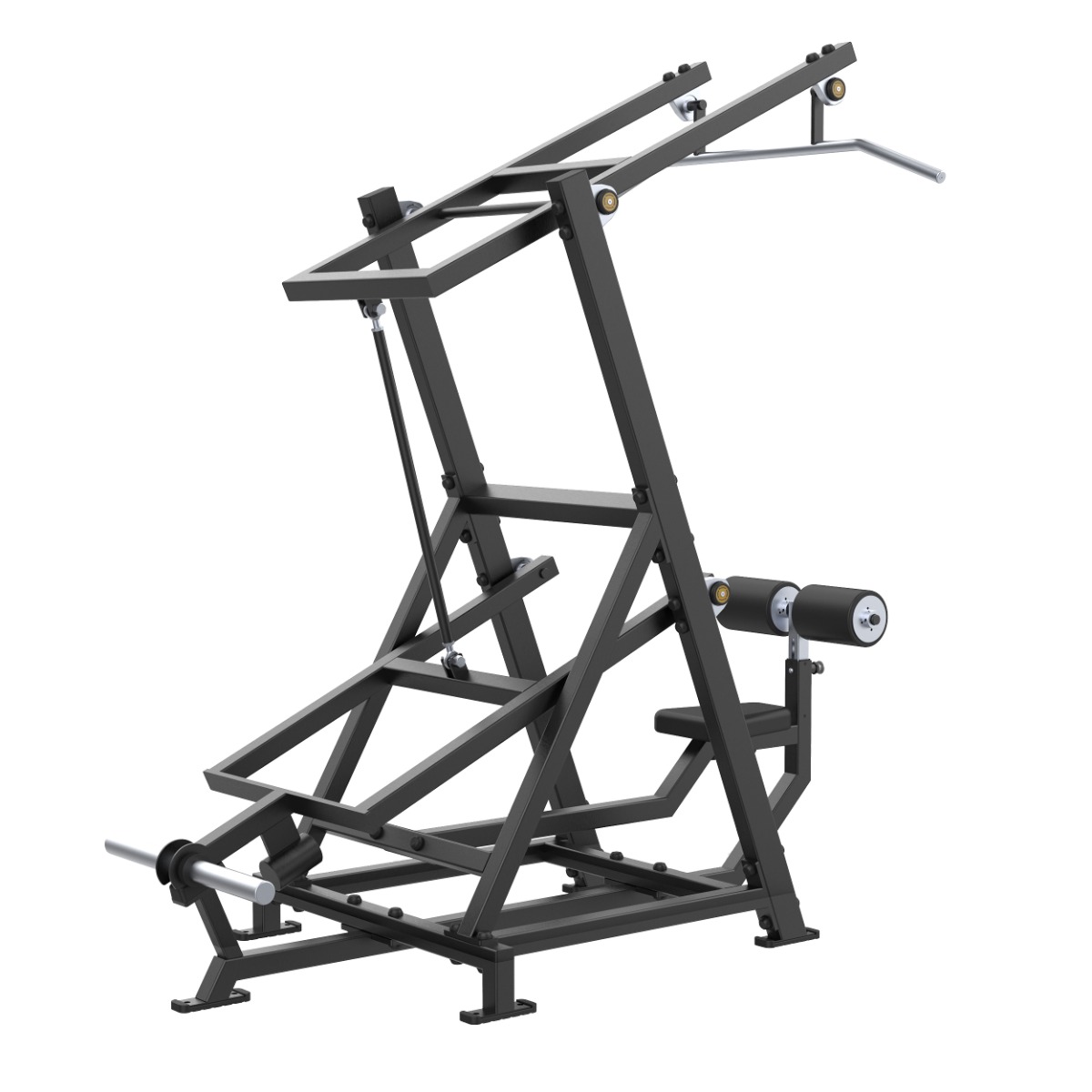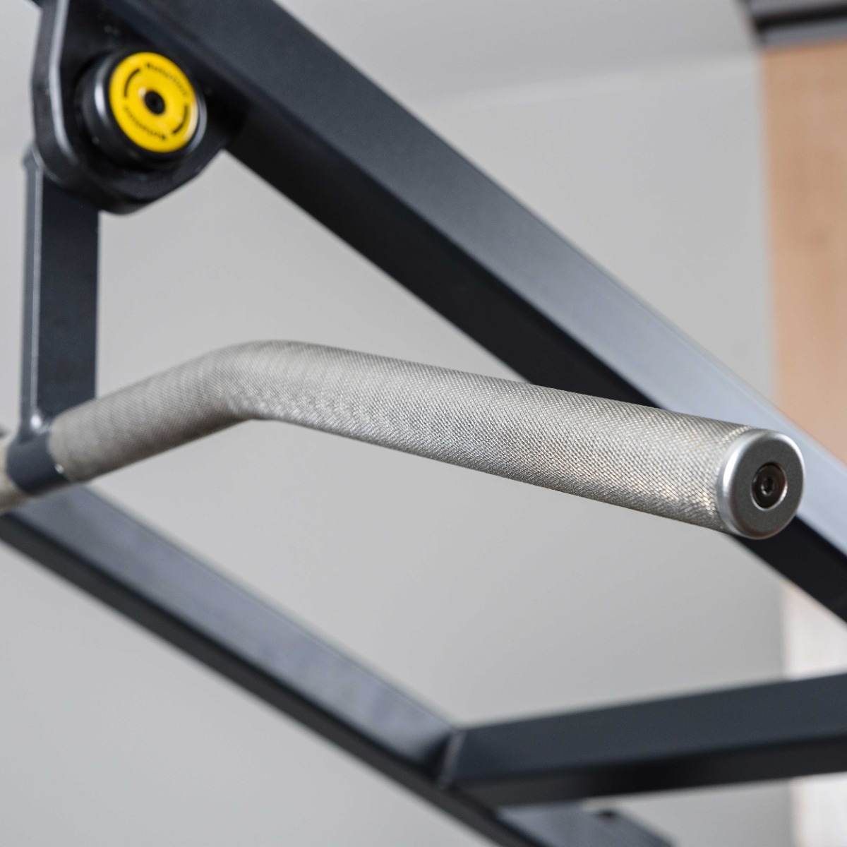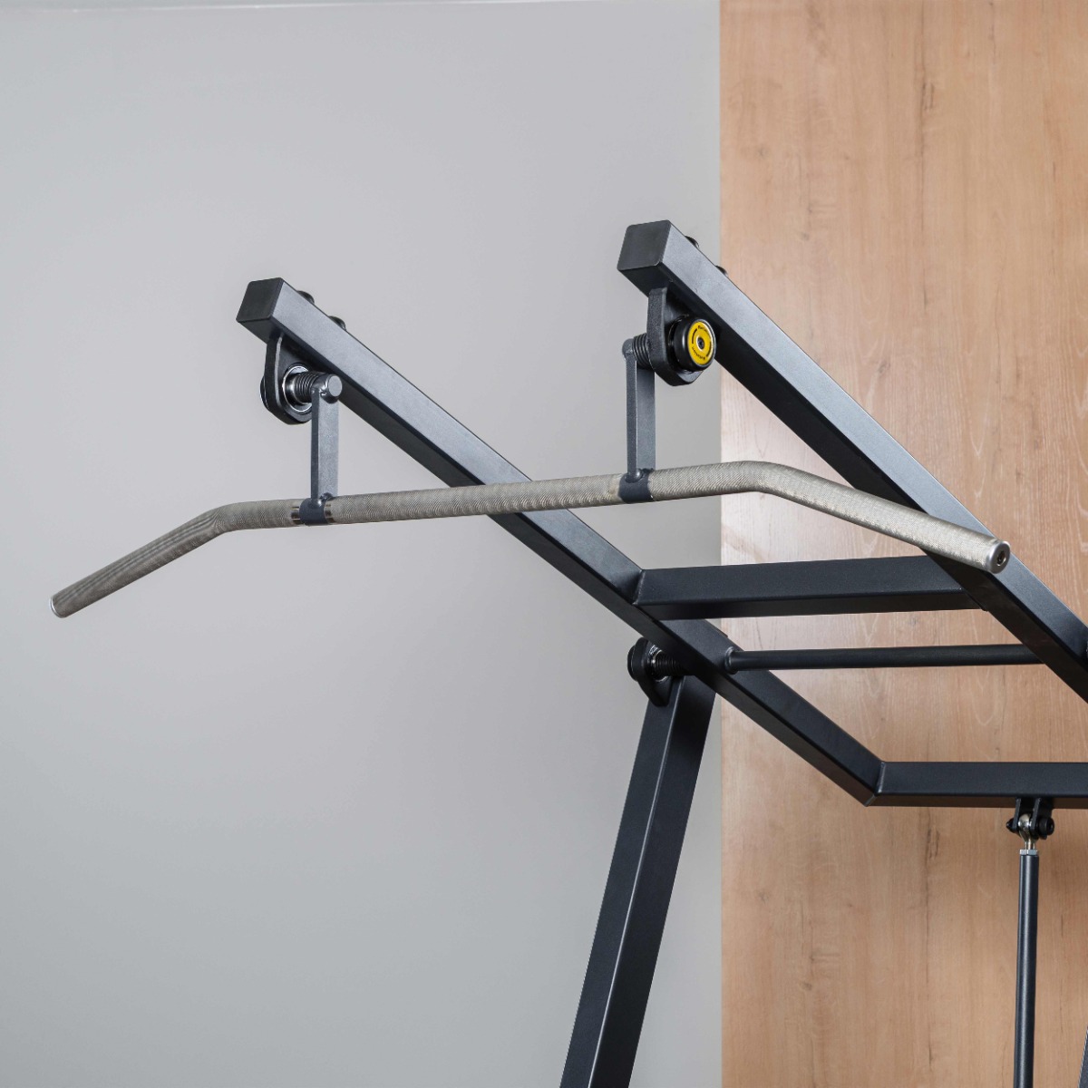Основная рукоять представляет собой цельную конструкцию длиной 1210 мм из металлического прутка диаметром 30 мм с мягкой ромбовидной накаткой. Рукоять установлена на подшипниковых узлах и перемещается по дугообразной траектории, что обеспечивает естественный ход движения и правильную биомеханику упражнения. Торцы рукояти закрыты металлическими заглушками с болтовой фиксацией.