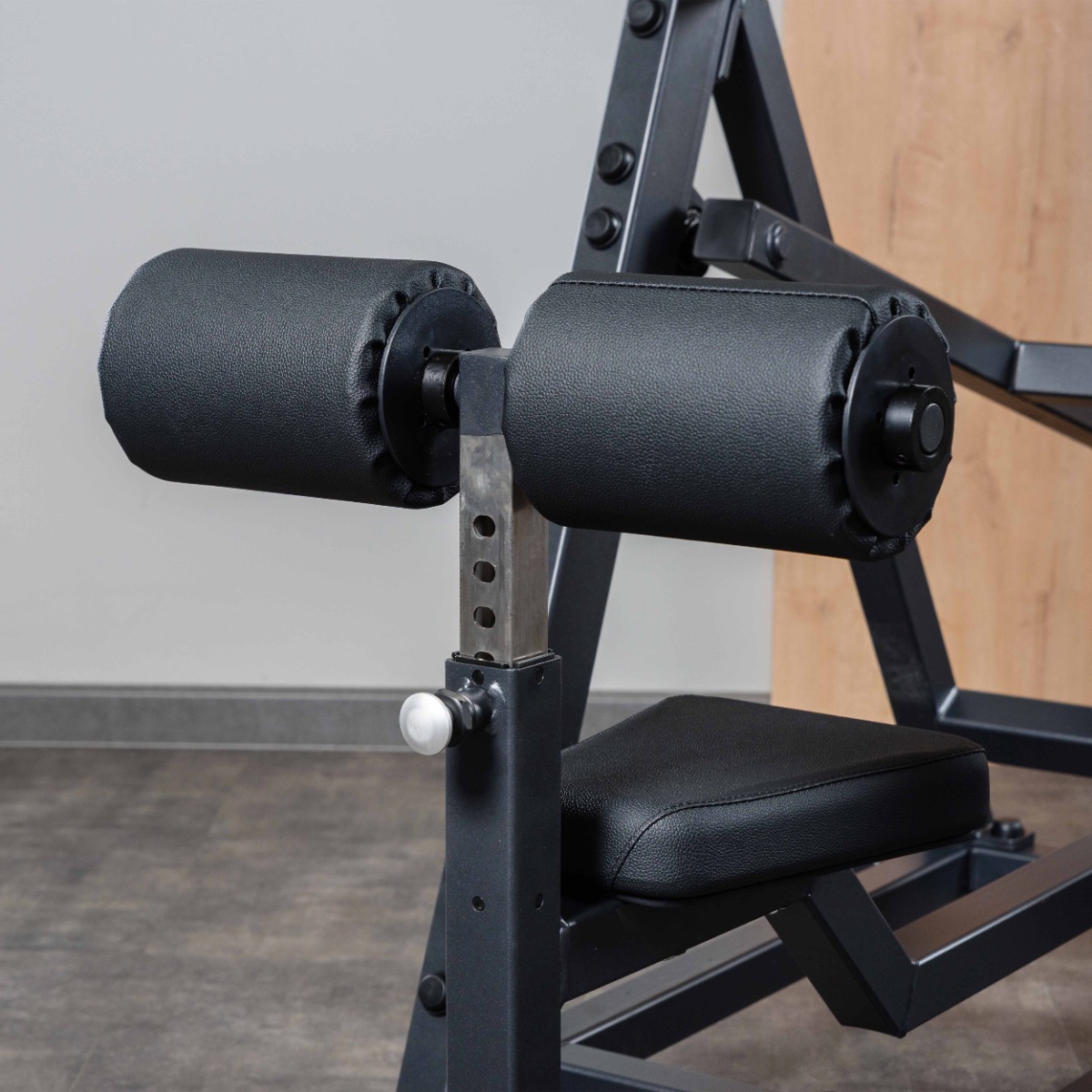 Поддерживающие валики длиной 200 мм и диаметром 140 мм вращаются вокруг собственной оси для удобства размещения ног. Высота установки валиков регулируется в восьми положениях с шагом 25 мм при помощи механического фиксатора. Расстояние между валиками: 90 мм.