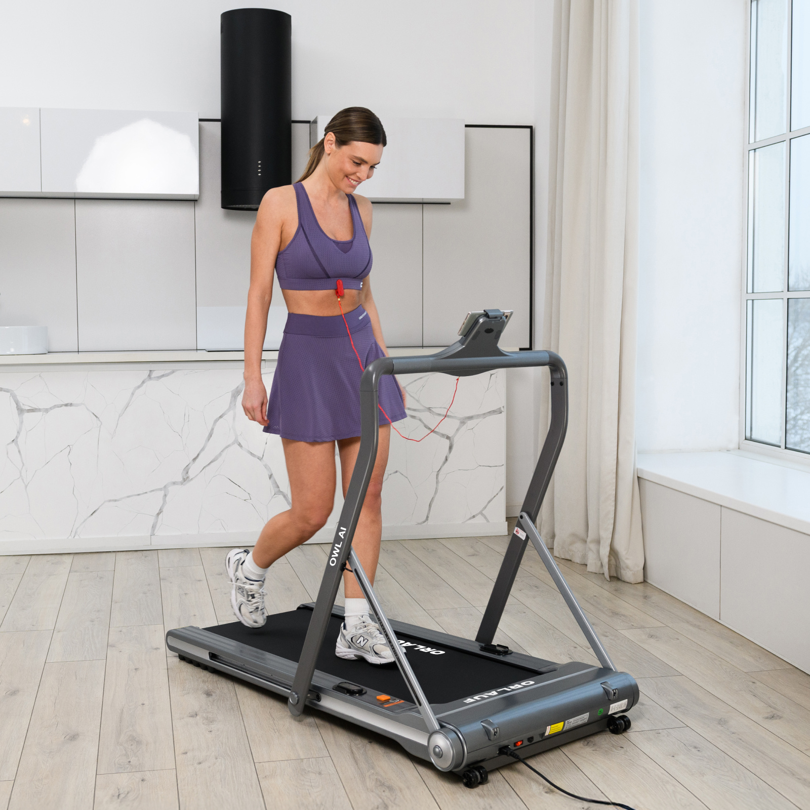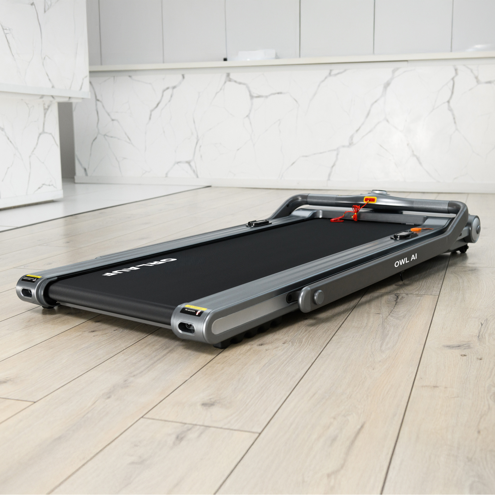 Электрическая беговая дорожка Orlauf Owl AI – это компактное решение для домашних тренировок. Модель отличается удобной системой складывания Click-Clack™, позволяющей быстро трансформировать дорожку одним движением. В сложенном виде толщина составляет всего 21 см, что обеспечивает удобное хранение как в горизонтальном, так и в вертикальном положении.