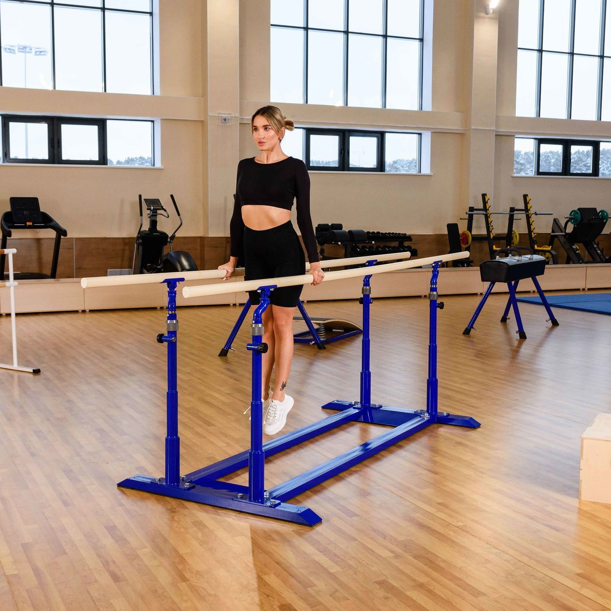 Конструкция рамы брусьев обеспечивает надежную, быструю фиксацию брусьев на стойке, а винтовой фиксатор позволяет плотно прижать брусья к стойке.