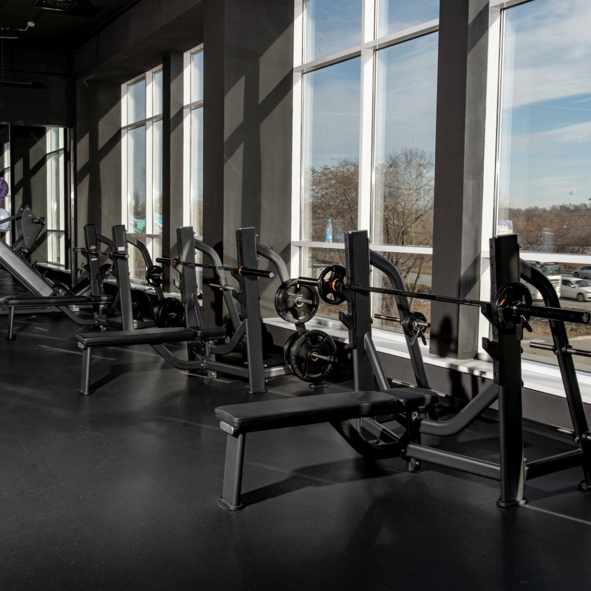 На раме тренажера закреплены двухуровневые опоры из пластика с четырьмя ложементами для фиксации штанги и предотвращения механического воздействия на раму и покрытие.