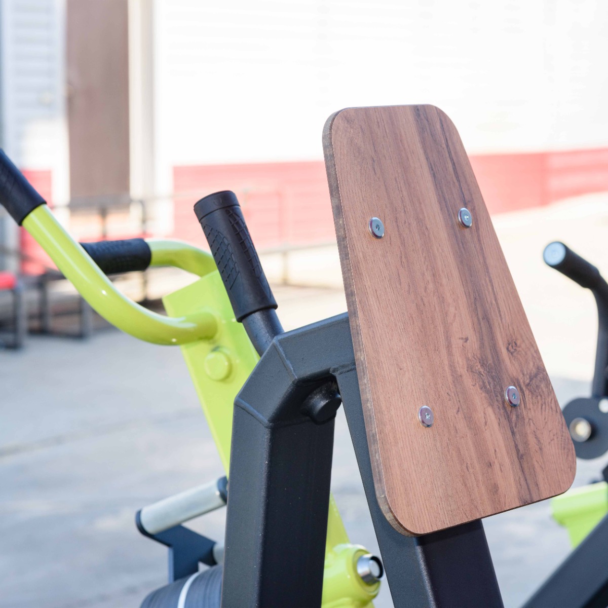 Сиденье 380×290 мм и спинка тренажера 380×290 мм выполнены из высокопрочного ударостойкого HPL-пластика толщиной 12 мм. Угол наклона спинки и сиденья 15°.