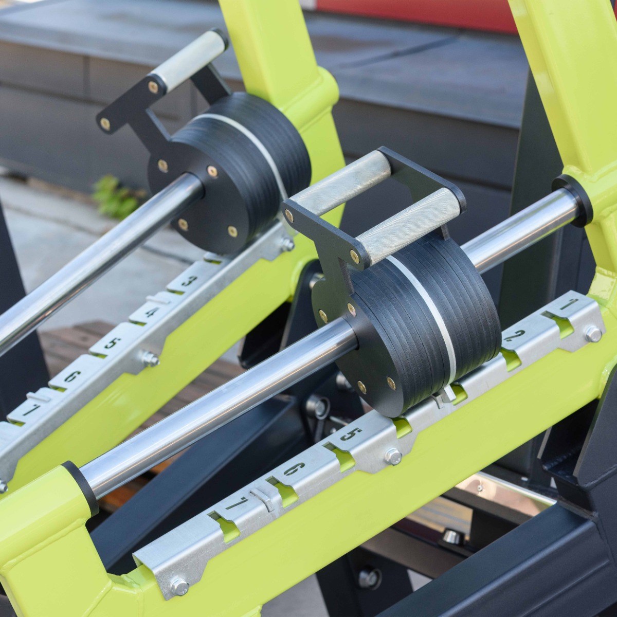 Стартовый вес на один подвижный рычаг 25 кг с шагом 2 кг. Плавное ступенчатое увеличение нагрузки доступно в 7 положениях. Общий стартовый вес на два рычага 50 кг, максимальный — 64 кг.