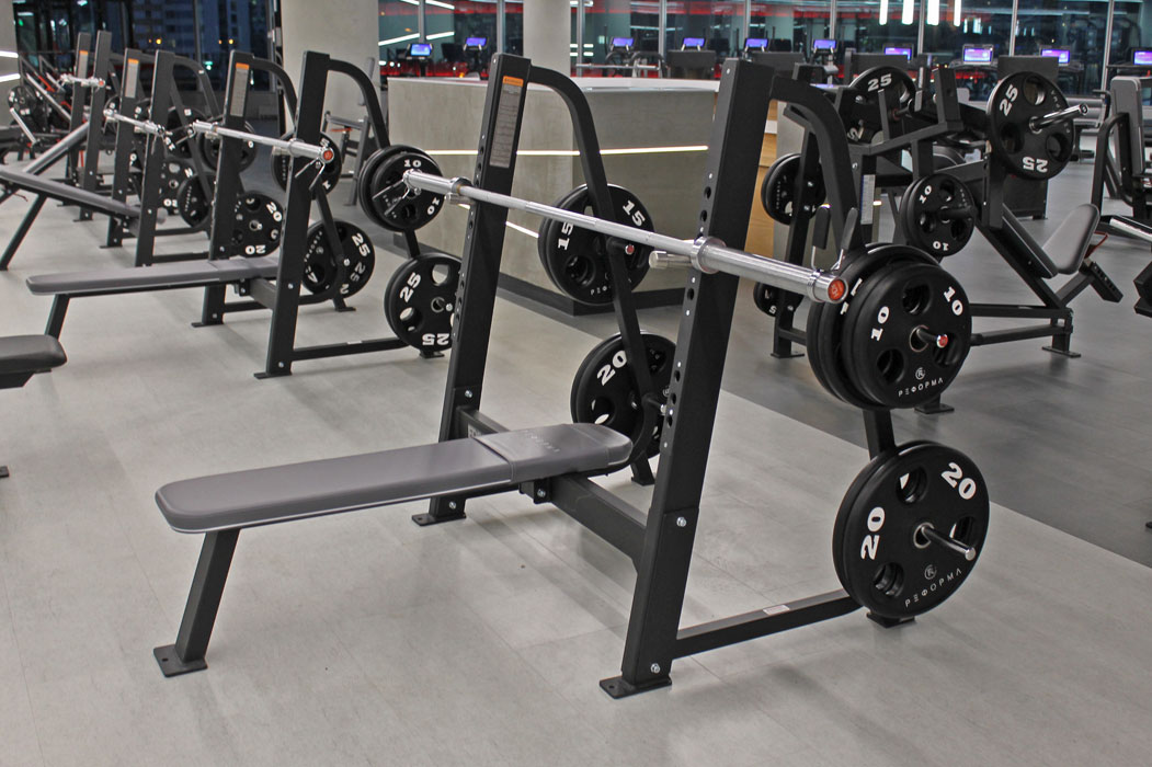 Олимпийская горизонтальная скамья FW-410 предназначена для выполнения упражнения, направленного на развитие мышц груди и трицепса.