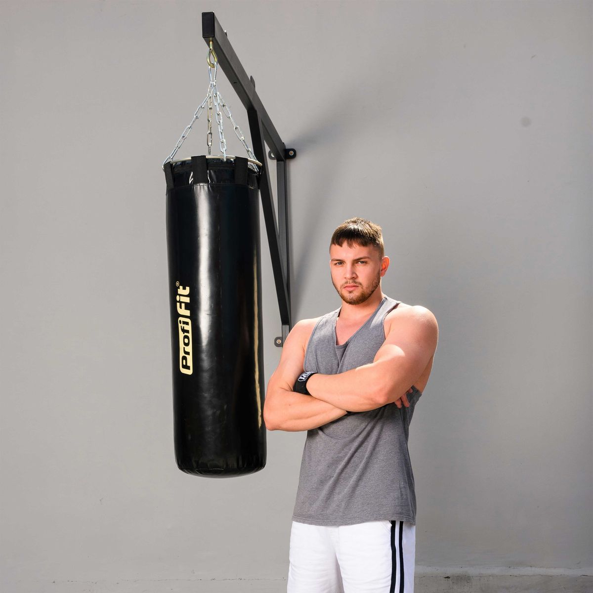 Подвес для боксерского мешка состоит из стального металлического кольца по диаметру мешка и четырех цепей, замкнутых карабином.