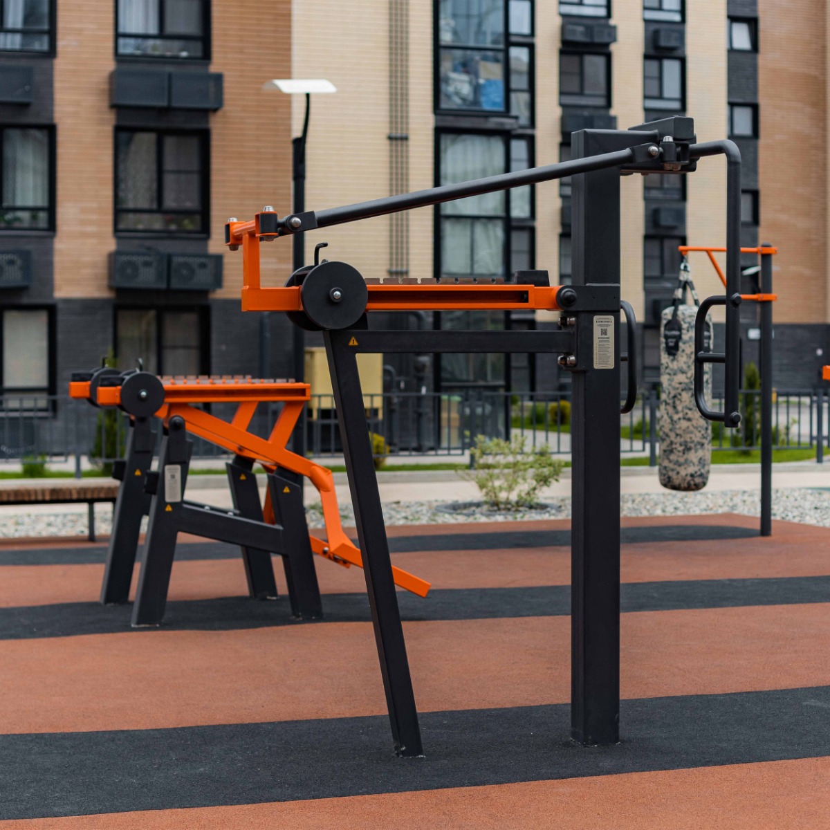 Оборудование состоит из закладной и тренажера. Закладная монтируется в грунт и заливается бетоном. Тренажер крепится к закладной за счет фланцевого соединения и отсыпается песчано-гравийной смесью до уровня площадки. Фланцевое крепление позволяет надёжно смонтировать тренажер и беспрепятственно демонтировать при необходимости ремонта. Монтажные схемы прилагаются к комплекту поставки.