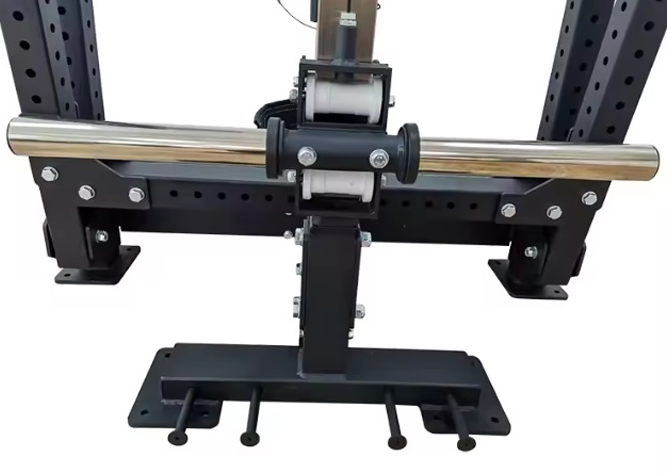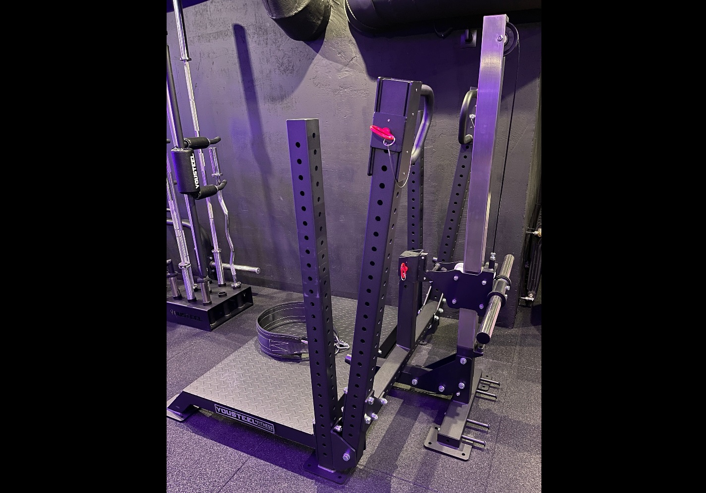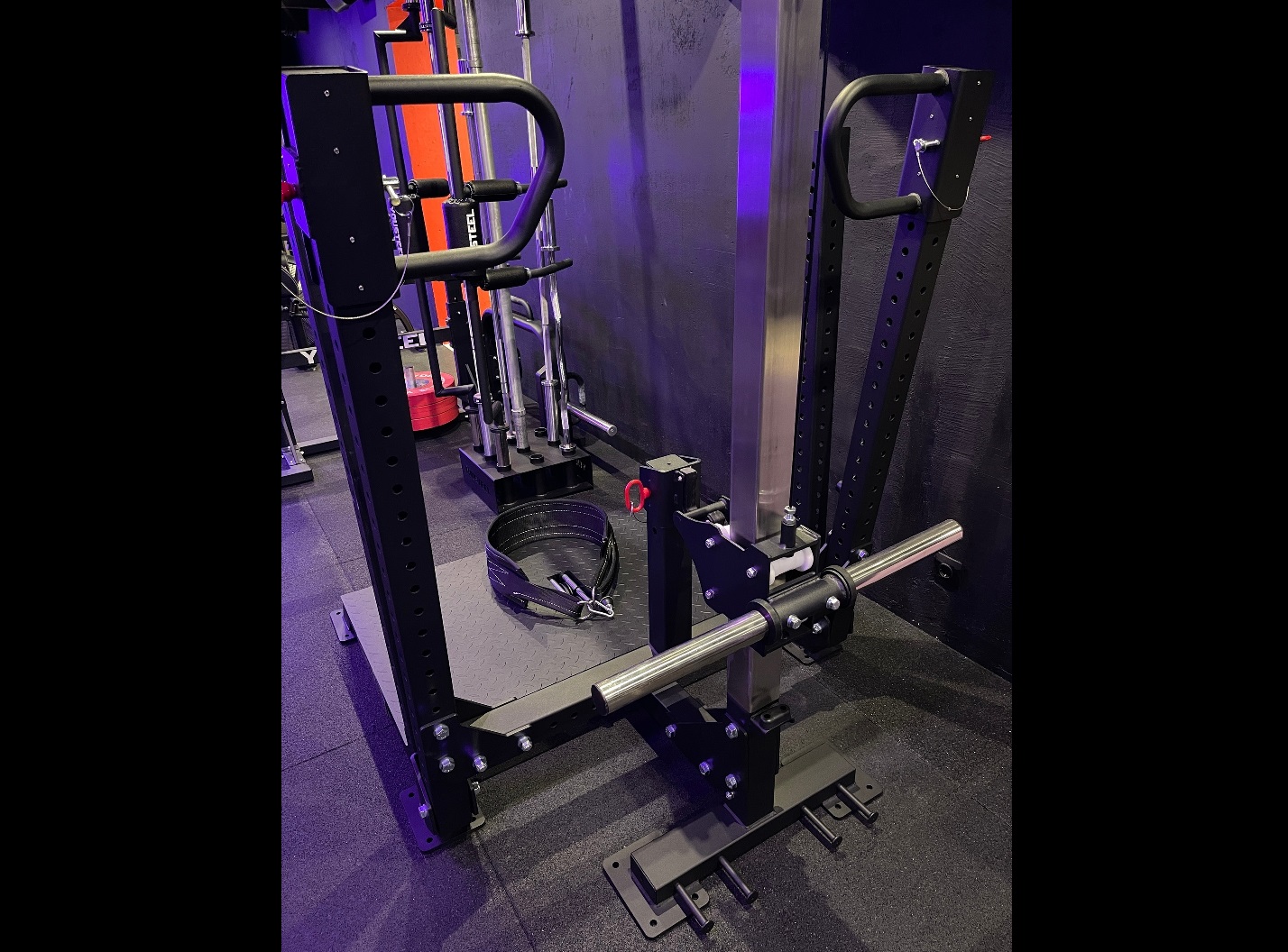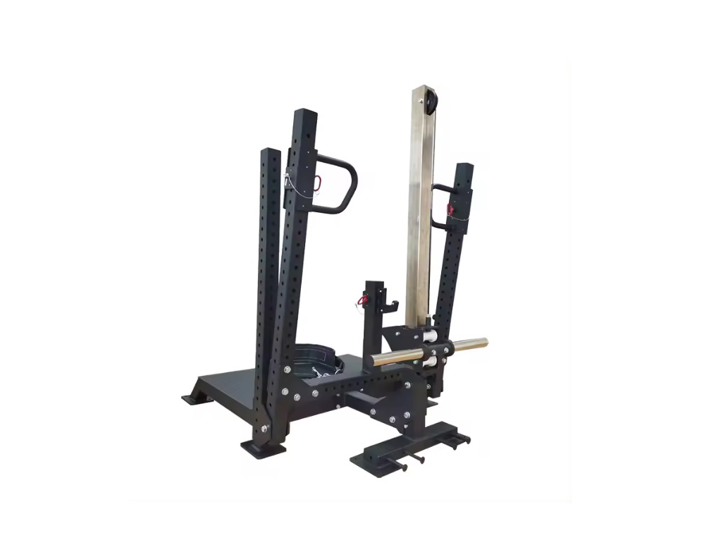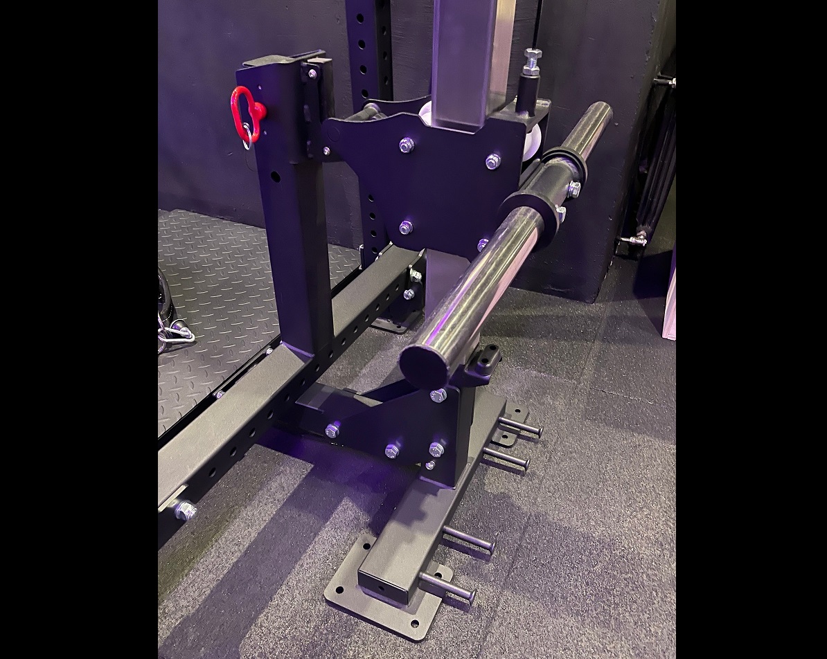 Уникальность данного тренажера в том, что он позволяет исключить осевую нагрузку на позвоночник, это дает возможность выполнять приседания с отягощением даже тем людям у которых есть травма спины. Также известный как присед в яму или присед в колодец, имеет следующие особенности: