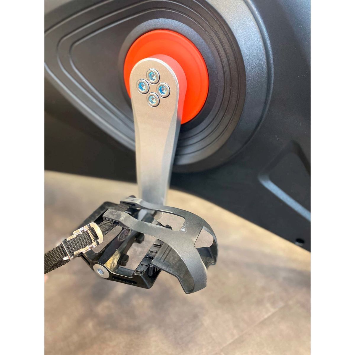 Профессиональные металлические педали покрыты полимерной краской. На педалях установлены пластиковые рифленые накладки для максимального сцепления с обувью. На педалях закреплены фиксаторы ног с ремешком для регулировки.
