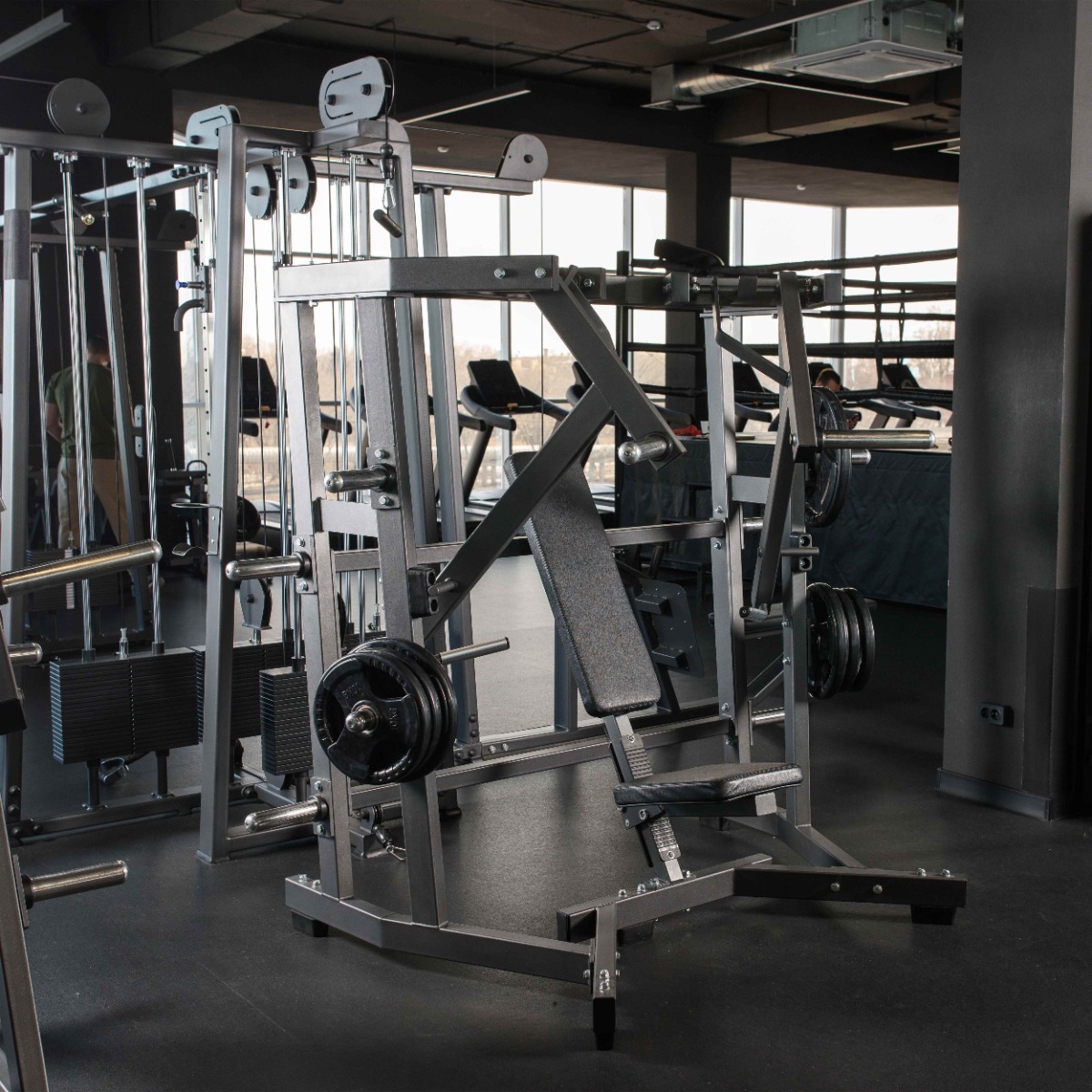Количество хромированных накопителей для хранения свободных весов: шесть накопителей длиной 170 мм из толстостенной стальной трубы диаметром 48 мм. Максимальный вес на накопитель: 100 кг.