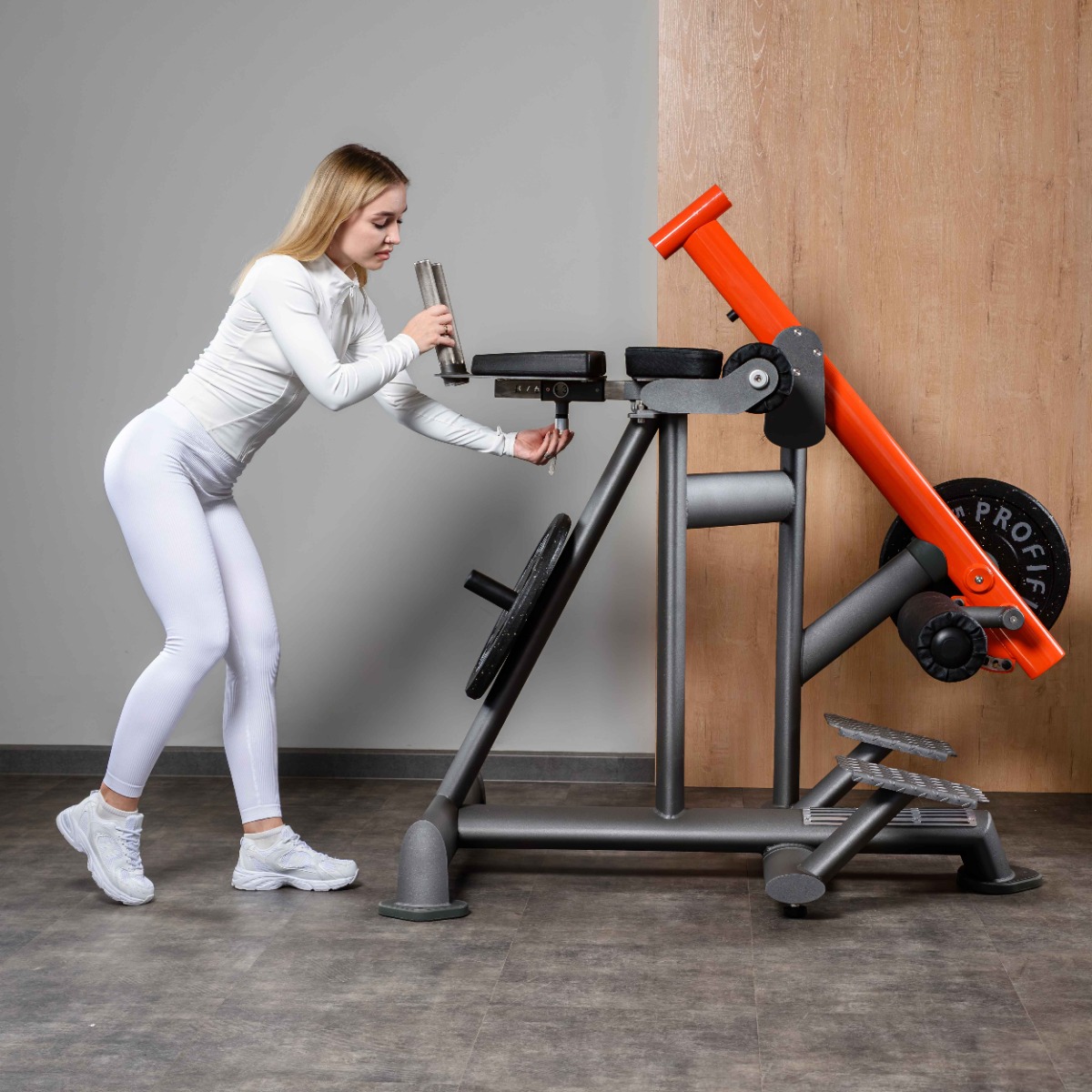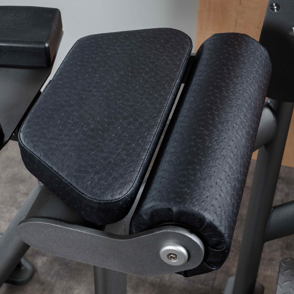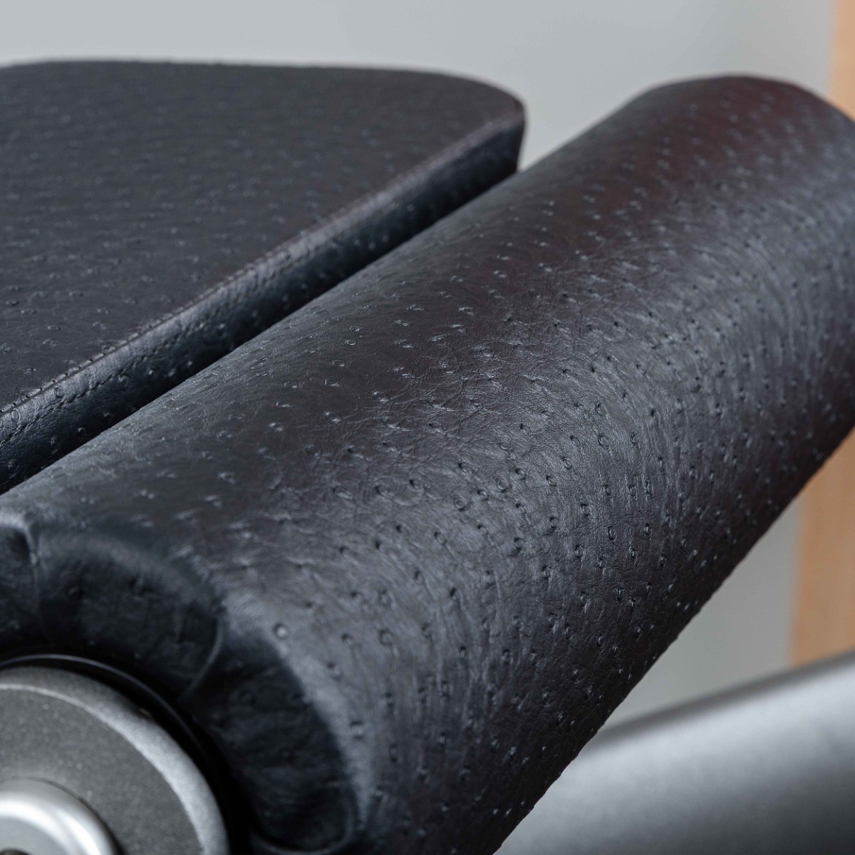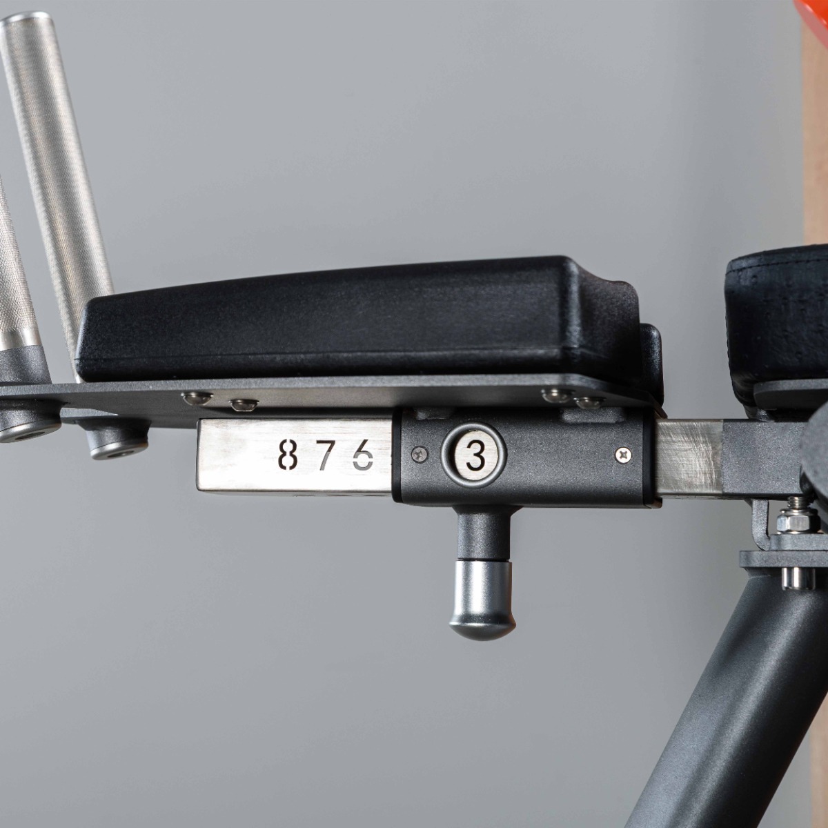 Регулировка положения валика осуществляется в восьми фиксированных положениях по дуге движения с помощью механического фиксатора, что позволяет адаптировать тренажёр под антропометрию спортсмена.