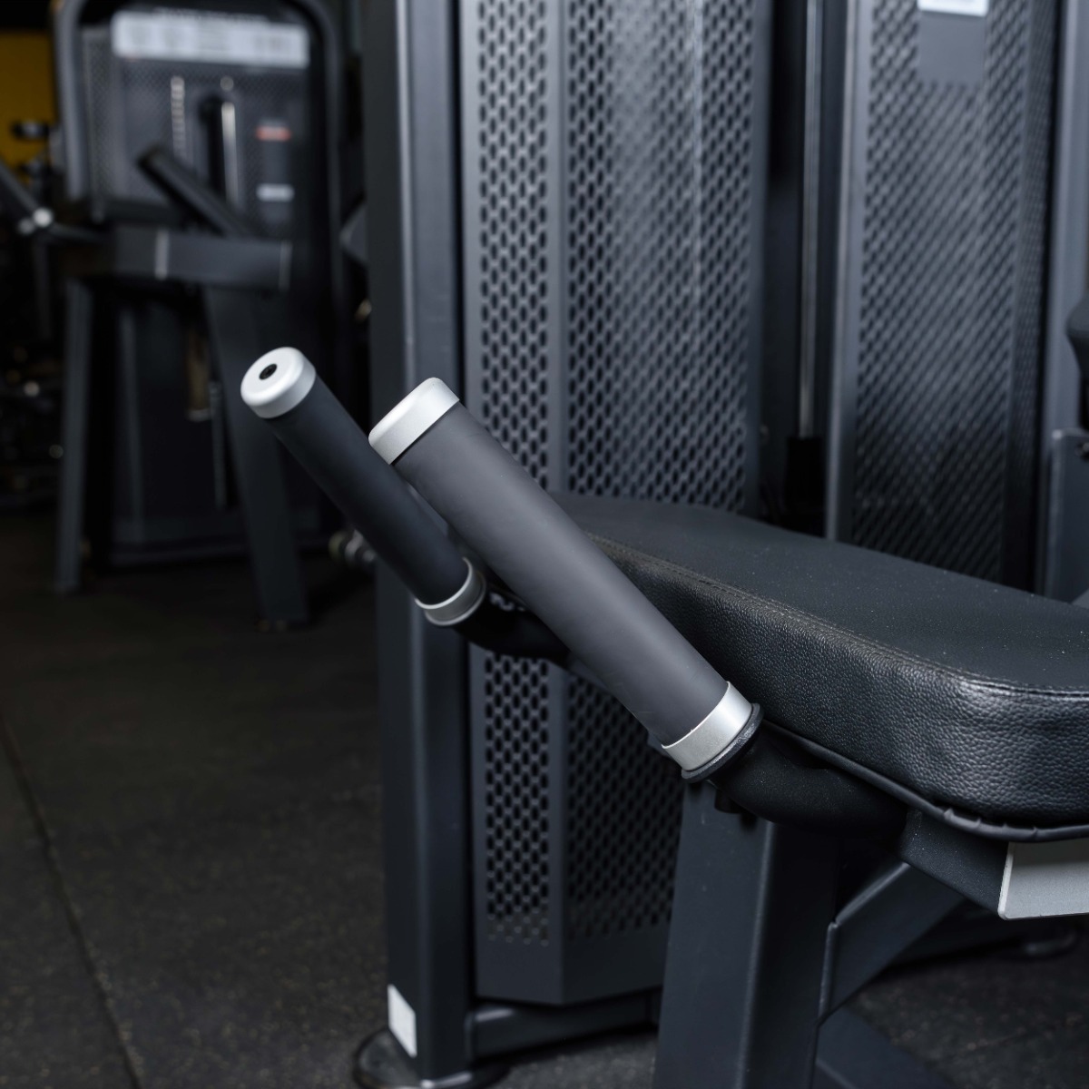 Нескользящие прочные рукоятки с резиновым покрытием и декоративными заглушками – наконечниками из полированного нержавеющего металла зафиксированные болтом, расположены под оптимальным углом для надежной фиксации тела атлета во время тренировки.