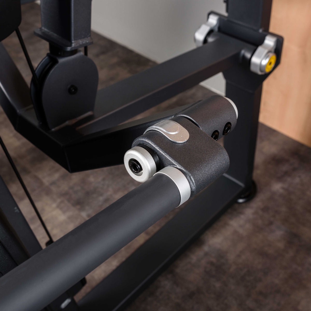Тренажер предназначен для выполнения упражнения на развитие широчайших мышц спины, трицепса и мышц грудной клетки. Выполняемое движение: жим вниз, естественная имитация рабочих движений при отжимании на брусьях.