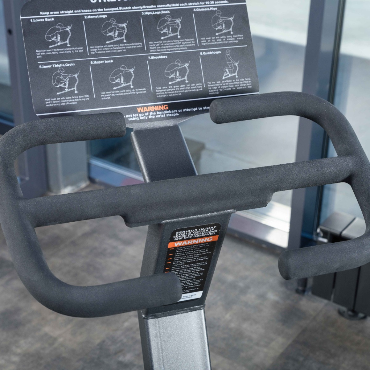 На металлической панели размещены восемь графических схем, демонстрирующих варианты выполнения упражнений для растяжки различных групп мышц.