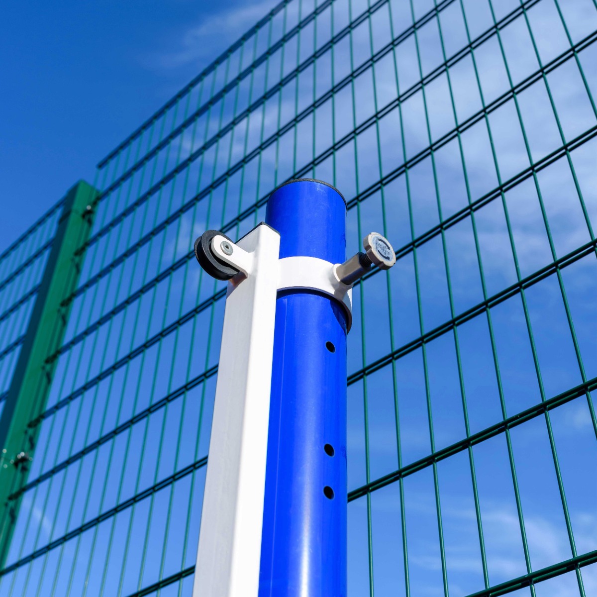 Стойка правая для волейбола представляет собой разборную конструкцию, состоящую из мачты, скользящего натяжного механизма и стакана.